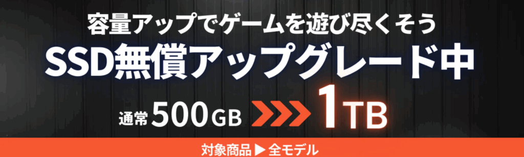全モデルを対象に、通常500GBのSSDが1TBに無償でアップグレードされるキャンペーンが実施されています。追加料金なしで容量が倍になるので、ゲームを複数インストールしたい方や大容量データを扱う方にとって実質的なお得感があります。