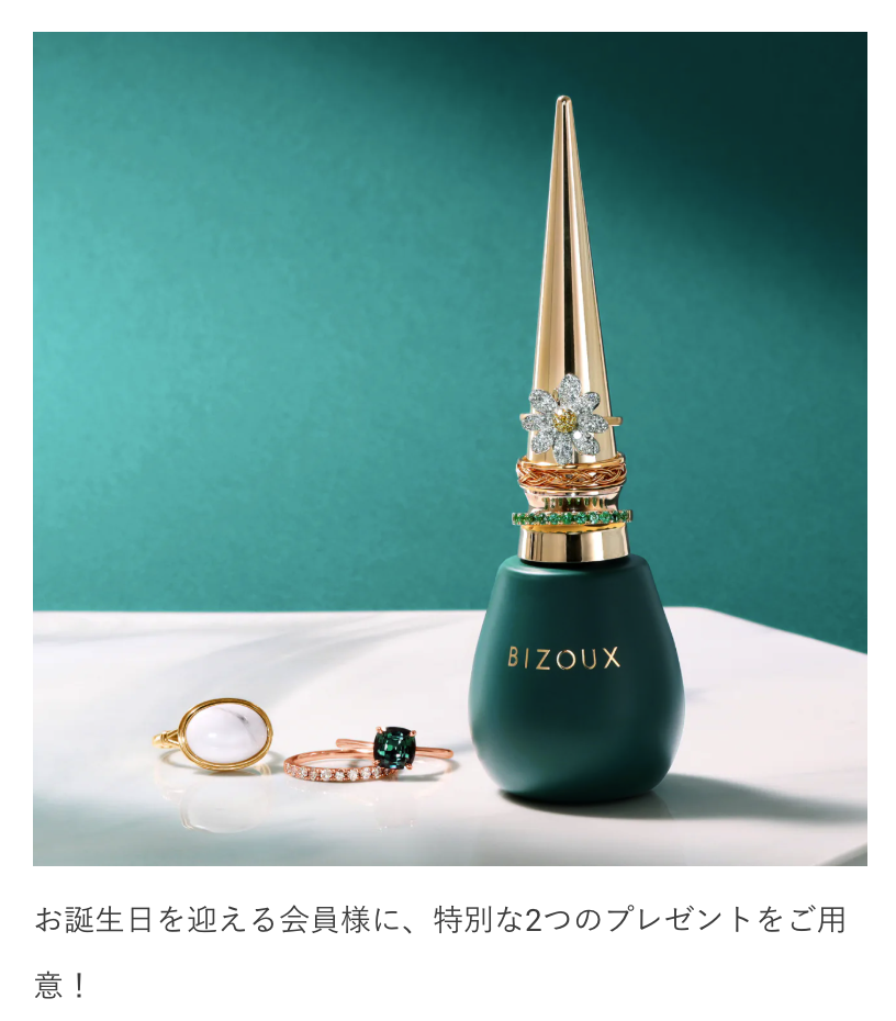 新作情報や、季節に合わせたおすすめの商品や宝石の紹介などBIZOUXの世界感を楽しめる、メールマガジンをお届け。