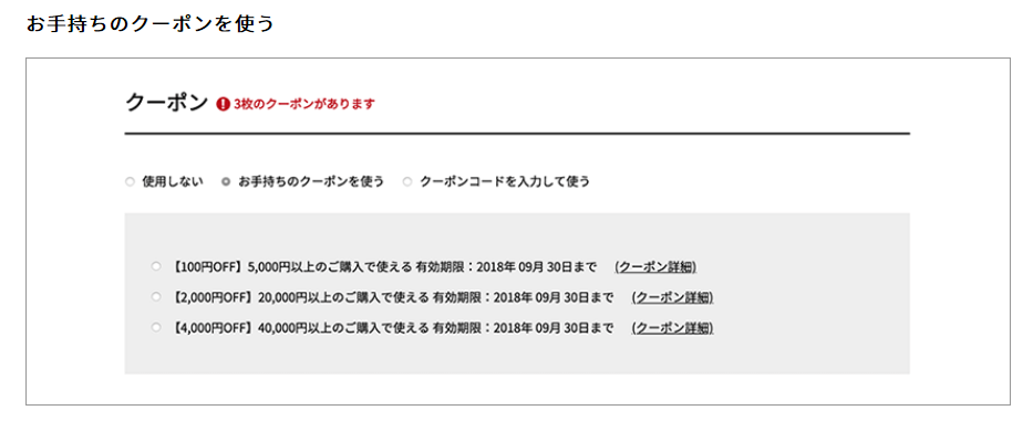 支払方法選択のクーポン利用設定項目で、「お手持ちのクーポンを使う」で使用するクーポンにチェックを入れてください。