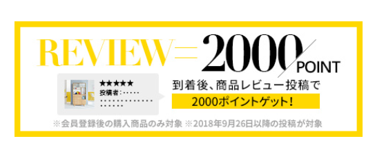 LOWYAでは商品到着後、商品レビューを投稿すると、2000ポイントがもらえます。