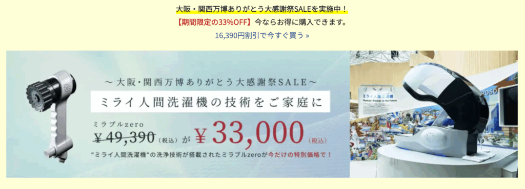 ミラブルzeroは大阪・関西万博ありがとう大感謝祭SALEとして、通常49,390円のところ33,000円(税込)で購入できます。16,390円の割引になる期間限定の特別価格です。