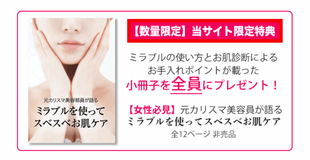 数量限定の当サイト限定特典として、元カリスマ美容員が監修した「ミラブルを使ってスベスベお肌ケア」の小冊子(全12ページ・非売品)が全員にプレゼントされます。使い方やお肌診断に基づくお手入れポイントが載っているので、初めて使う方にも役立つ内容です。