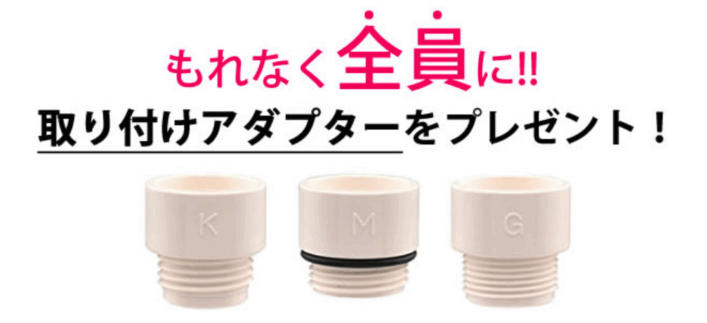 購入者全員に取り付けアダプター(K・M・G の3種類)がプレゼントされます。自宅のシャワー口に合わせて使えるので、取り付けに困る心配がありません。
