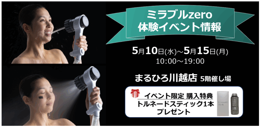5月10日(水)〜15日(月)の10:00〜19:00に、まるひろ川越店5階催し場でミラブルzeroの体験イベントが開催されます。イベント限定の購入特典として、トルネードスティック1本がプレゼントされます。実際に試してから購入したい方にもおすすめです。