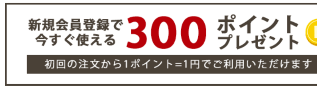 新規で会員登録すると300ポイントがプレゼントされ、初回の注文から1ポイント=1円として使えます。登録するだけで実質300円分の値引きになるので、初めて利用する方はまず会員登録をしておくのがおすすめです。