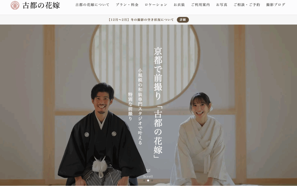 古都の花嫁は、京都で和装前撮り・フォトウェディングなら「古都の花嫁」へ。静かな寺院を貸切にしたロケーションで人目を気にせず撮影、衣装追加料金なし・全データ込みの明瞭価格プランで安心。30代以上から支持される和装専門スタジオで本格的な結婚写真を。