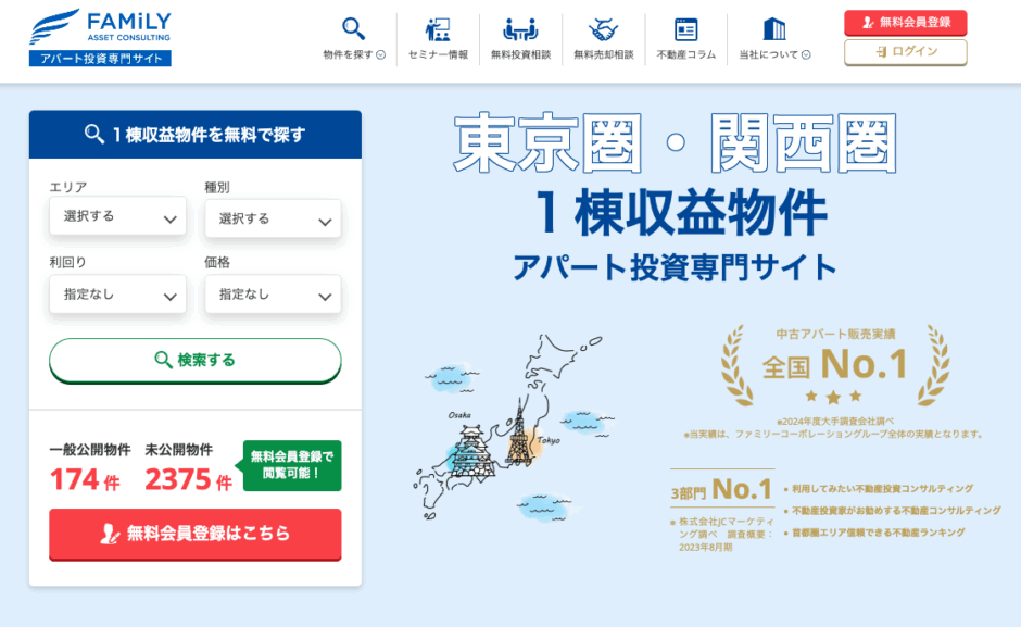 中古アパート投資ならファミリーアセットコンサルティング。一棟売りアパートを中心に、年間400件を超える取引実績があり、富裕層だけでなくあらゆる層の資産形成をサポートしています。