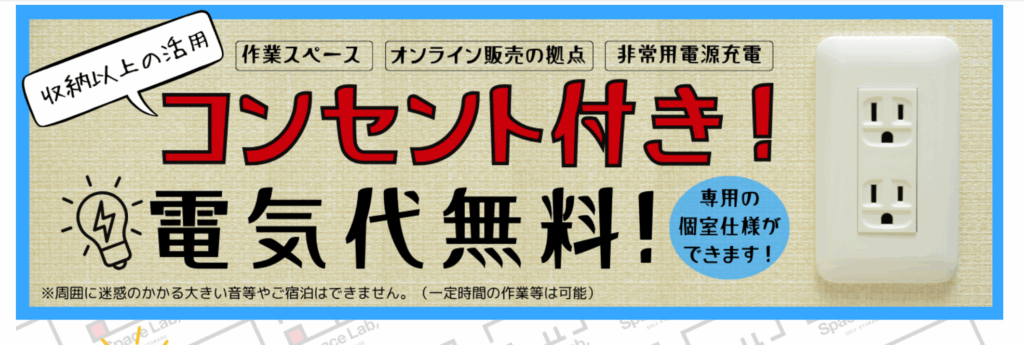 ユニット内にコンセントが備わっており、電気代は無料で利用できます。単なる収納スペースとしてだけでなく、作業スペースやオンライン販売の拠点、非常用電源の充電場所としても活用できます。