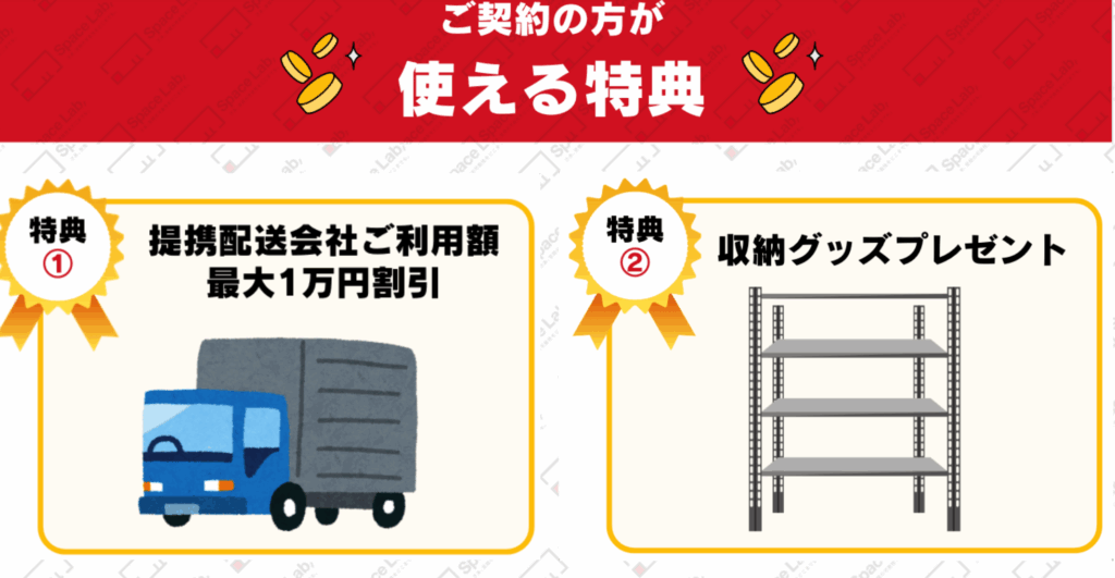 スペースラボでは、4畳以上のスペースを契約した方向けに、提携配送会社の利用額が最大1万円引きになる特典があります。引越しや荷物の搬入で配送業者を使う予定がある方には、実質的なコスト削減になります。