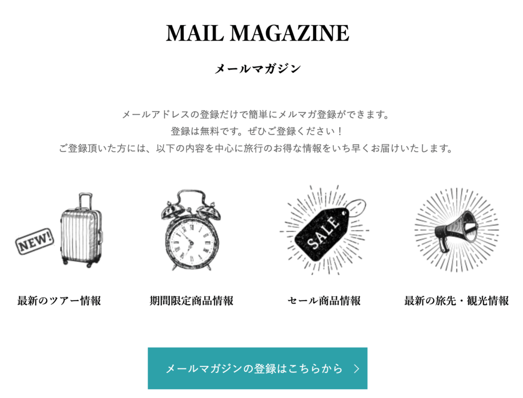 メールアドレスを登録するだけで、最新ツアー情報や期間限定商品、セール情報などを優先的に受け取れます。旅行の予定が決まっていなくても、タイムセールや特別プランの案内が届くので、お得なタイミングを逃しにくくなります。