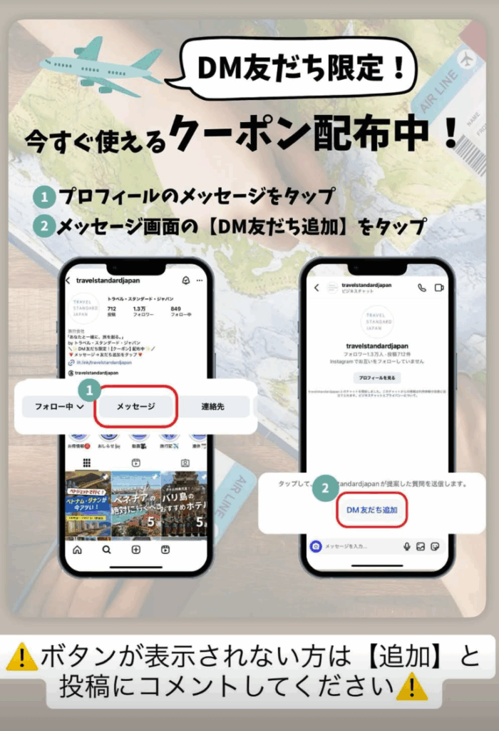 トラベル・スタンダード・ジャパンの公式Instagramでは、DMで「友だち追加」をするだけで今すぐ使えるクーポンが配布されています。プロフィールのメッセージボタンをタップし、メッセージ画面に表示される「DM友だち追加」をタップするだけで受け取れます。ボタンが表示されない場合は、投稿に「追加」とコメントすることで対応してもらえます。