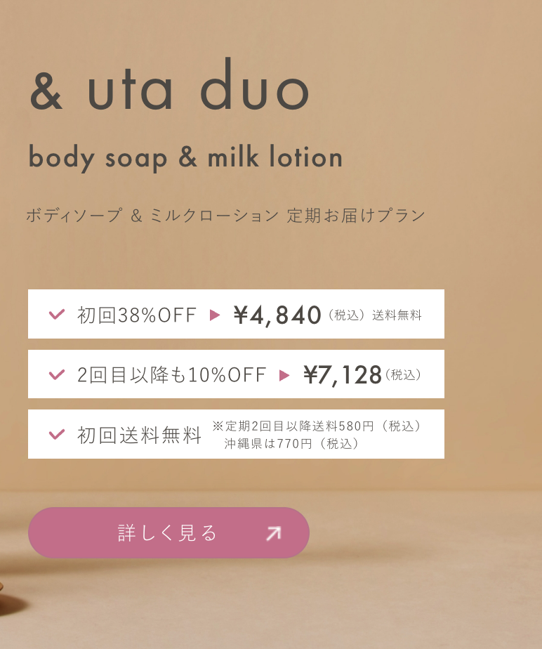 & uta duoのボディソープ&ミルクローションセットは、定期お届けプランを選ぶと初回が38%OFFの4,840円(税込・送料無料)で購入できます。2回目以降も10%OFFの7,128円(税込)が続くので、リピートする予定があれば定期便一択といえます。
